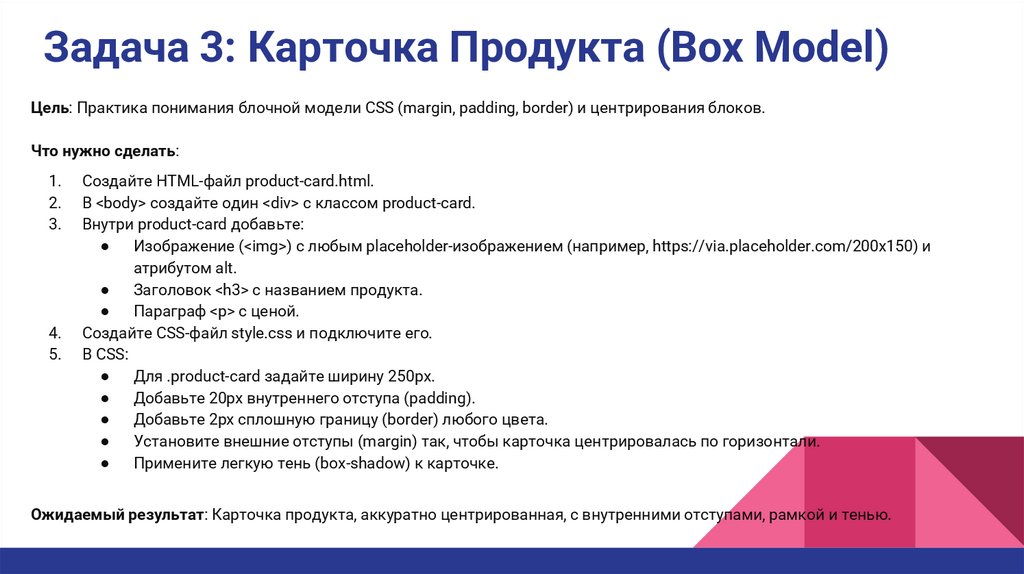 Задача 3: Карточка Продукта (Box Model)Цель: Практика понимания блочной модели CSS (margin, padding, border) и центрирования блоков.