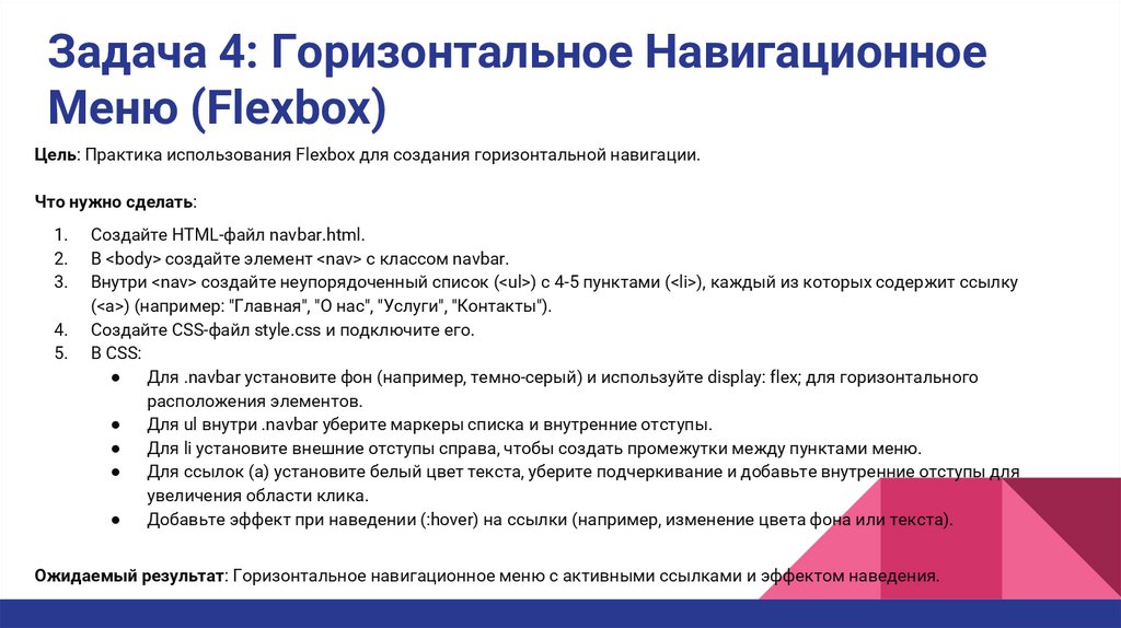 Задача 4: Горизонтальное НавигационноеМеню (Flexbox)