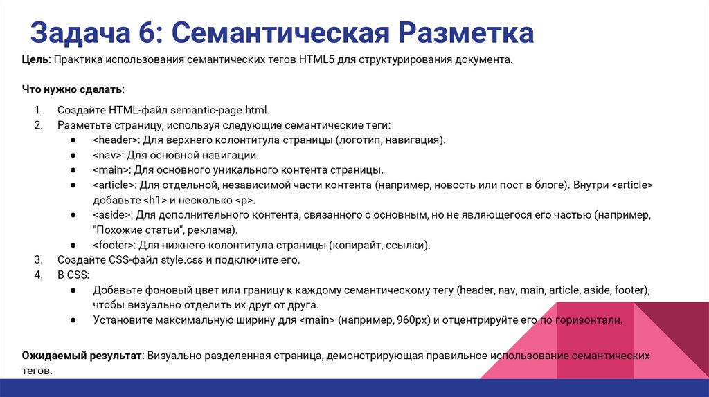 Задача 6: Семантическая РазметкаЦель: Практика использования семантических тегов HTML5 для структурирования документа.