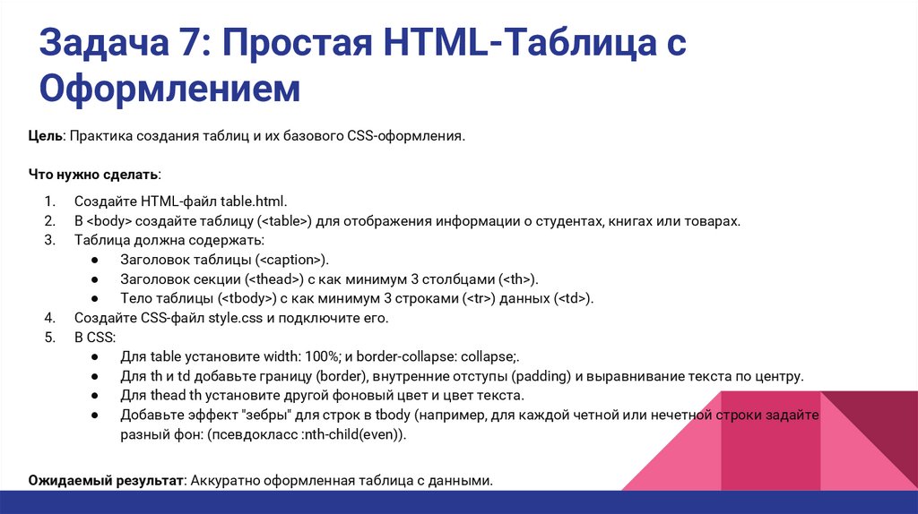 Ожидаемый результат: Аккуратно оформленная таблица с данными.
