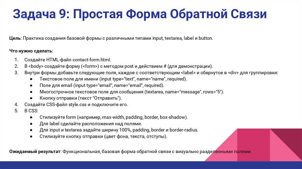 Задача 9: Простая Форма Обратной СвязиЦель: Практика создания базовой формы с различными типами input, textarea, label и button.
