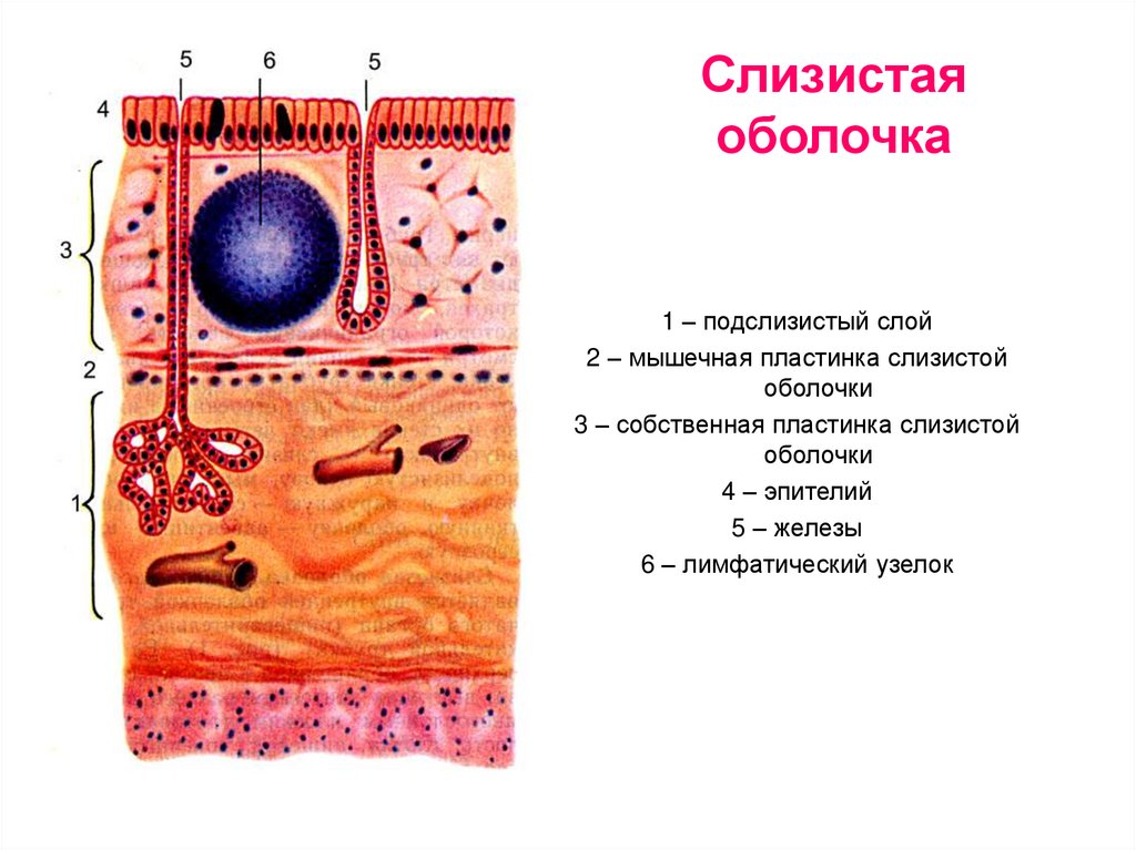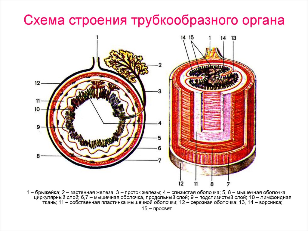 состоящий из трех оболочек: слизистой, мышечной и серозной. Слизистая оболочка выстлана цилиндрическим эпителием и собрана в продольные