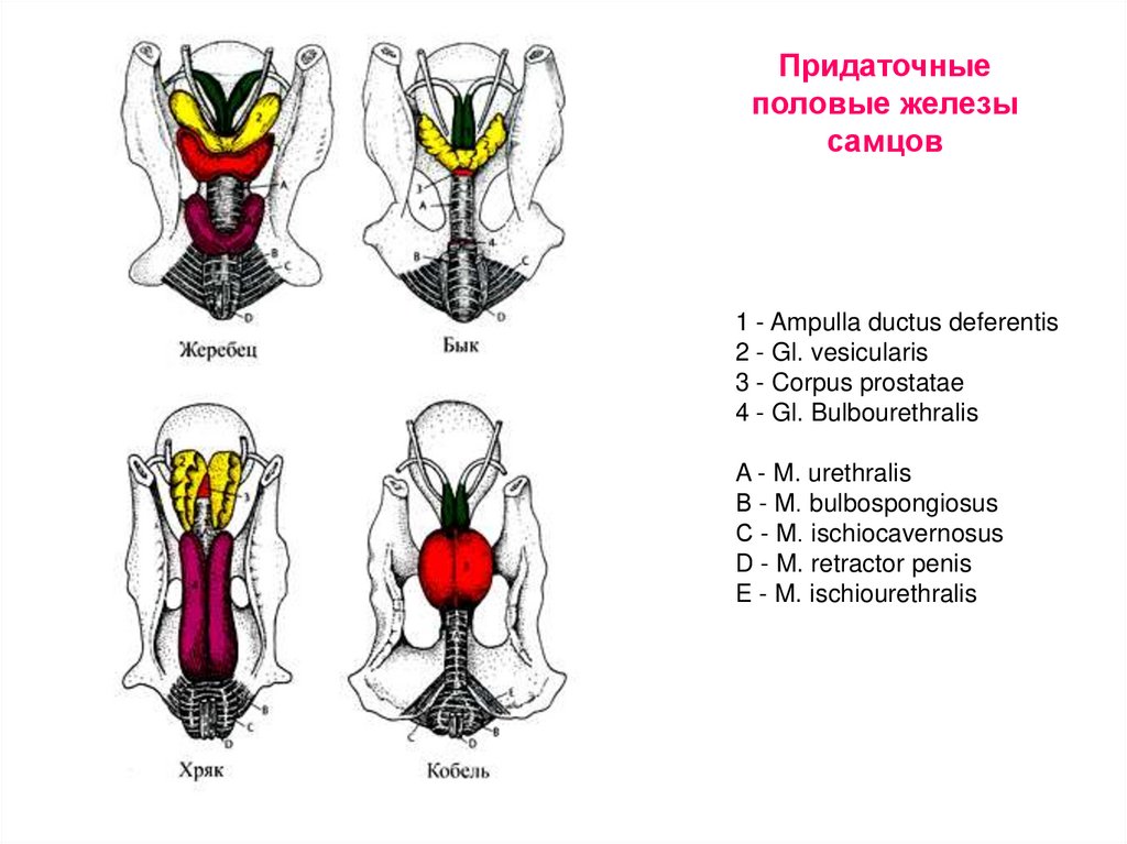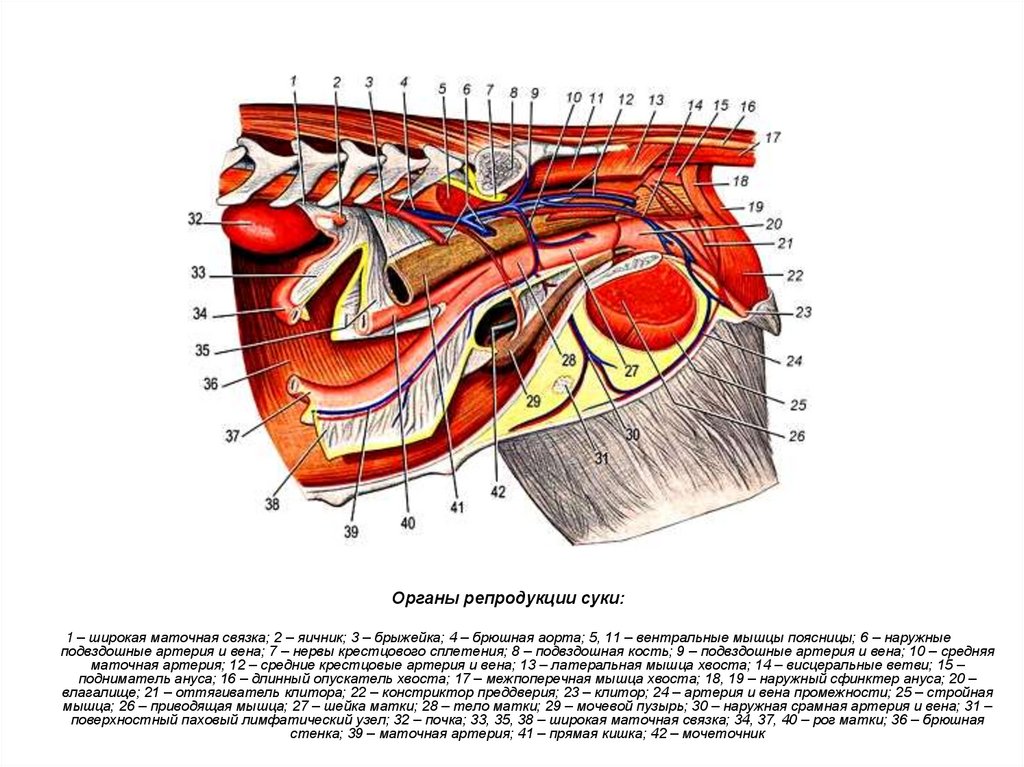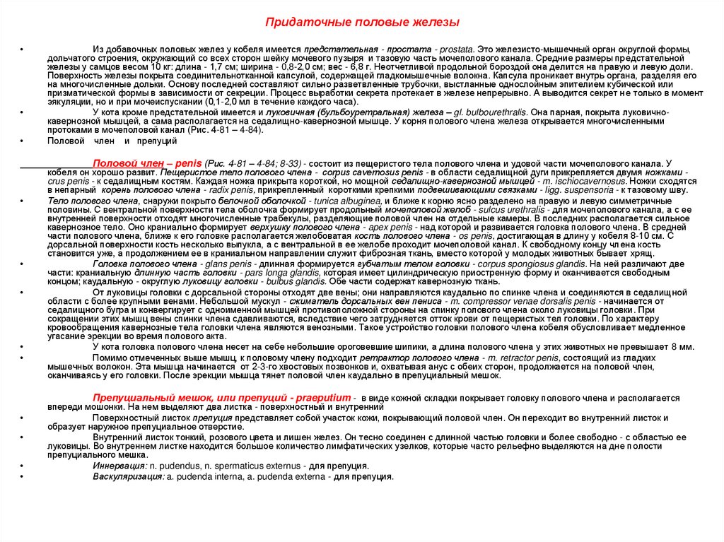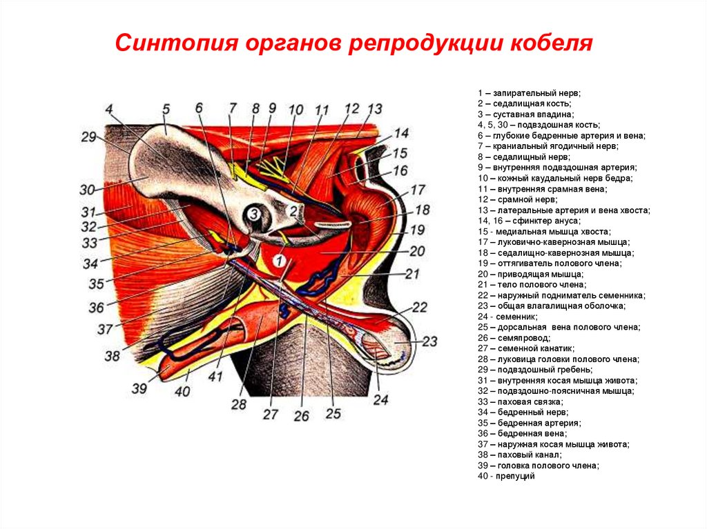 кобеля он хорошо развит. Пещеристое тело полового члена - corpus cavernosus pеnis - в области седалищной дуги прикрепляется двумя ножками crus penis - к седалищным костям. Каждая ножка прикрыта короткой, но мощной седалищно-кавернозной мышцей - m. ischiocavernosus. Ножки сходятся