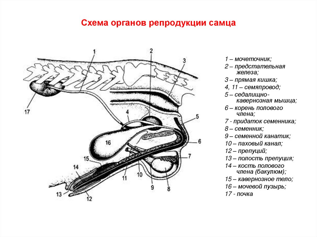 части полового члена, ближе к его головке располагается желобоватая кость полового члена - os penis, достигающая в длину у кобеля 8-10 см. С