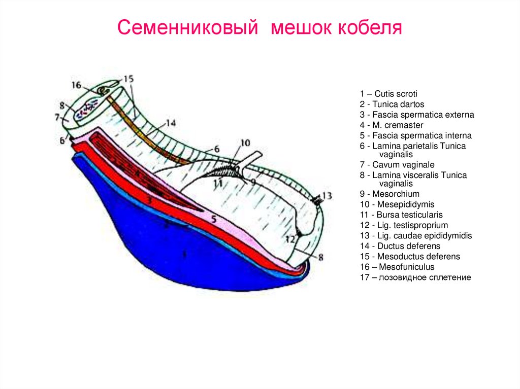 прикрепленного к семеннику и его придатку, а вершиной направленного к паховому каналу. В краниальной части он содержит внутреннюю семенную
