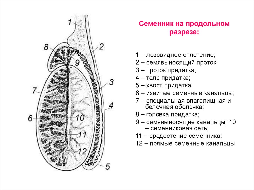 Семяпровод выходит из хвоста придатка семенника и является прямым продолжением его канала. В дальнейшем в составе семенного