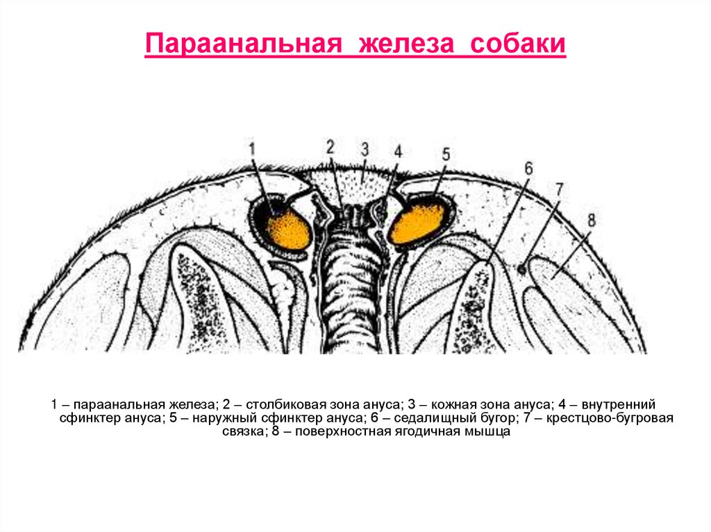 Мошонка - scrotum - располагается у кобеля между бедрами, а у котов - вентральнее заднего прохода и каудальнее седалищных костей.