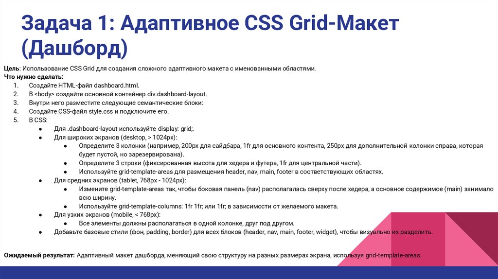 Ожидаемый результат: Адаптивный макет дашборда, меняющий свою структуру на разных размерах экрана, используя grid-template-areas.