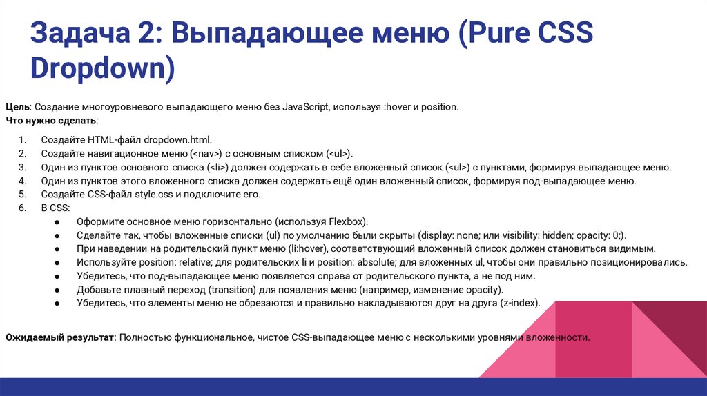 Ожидаемый результат: Полностью функциональное, чистое CSS-выпадающее меню с несколькими уровнями вложенности.