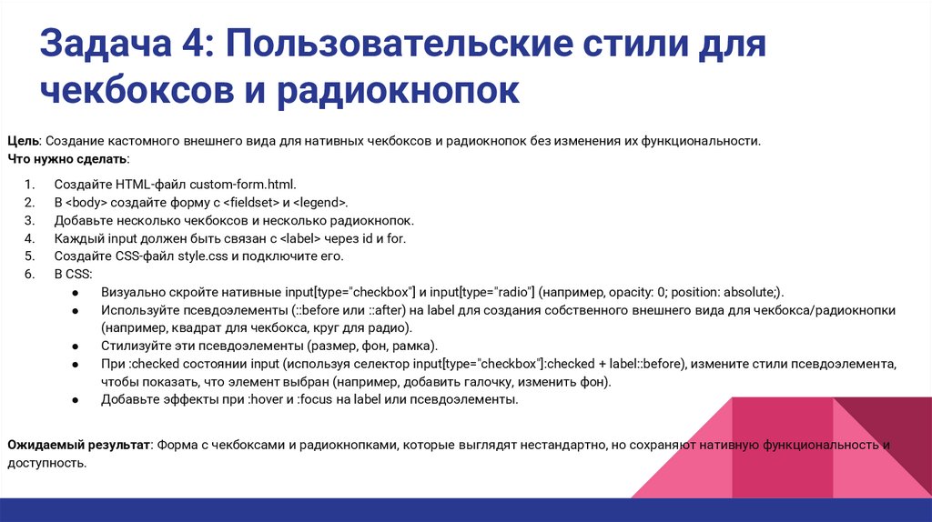 Задача 4: Пользовательские стили длячекбоксов и радиокнопок