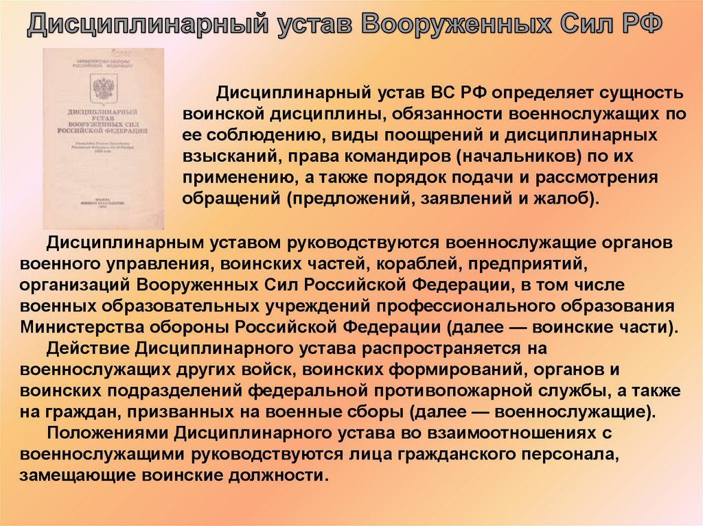 Дисциплинарный устав ВС РФ определяет сущностьвоинской дисциплины, обязанности военнослужащих по