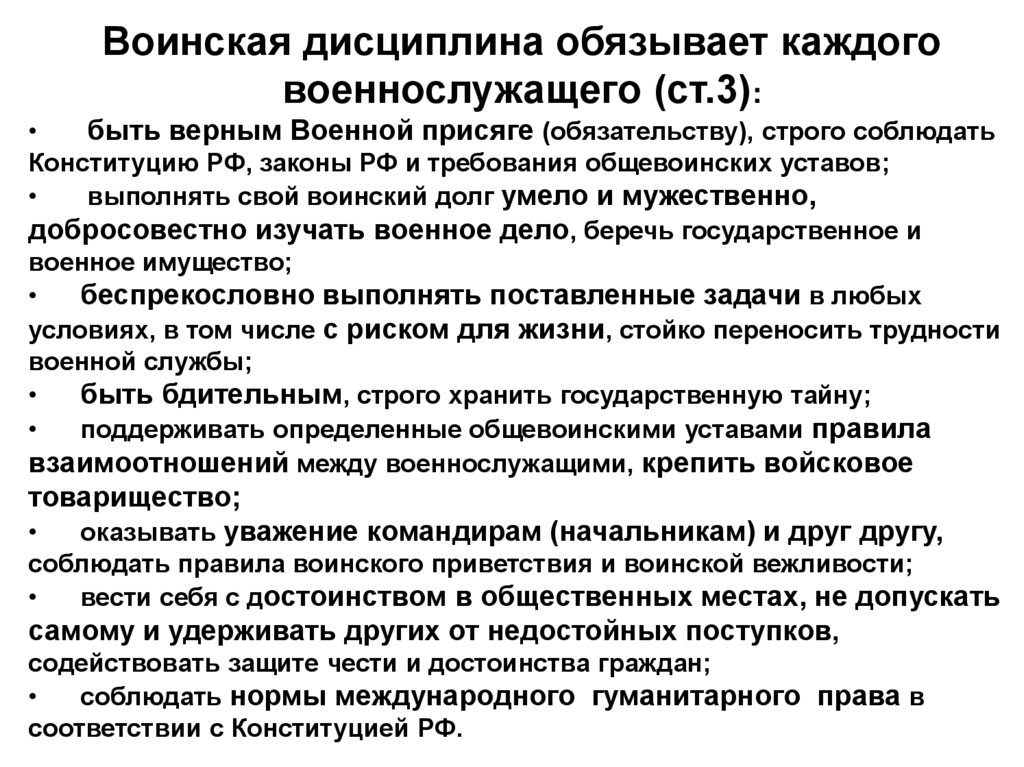 Воинская дисциплина обязывает каждоговоеннослужащего (ст.3):
