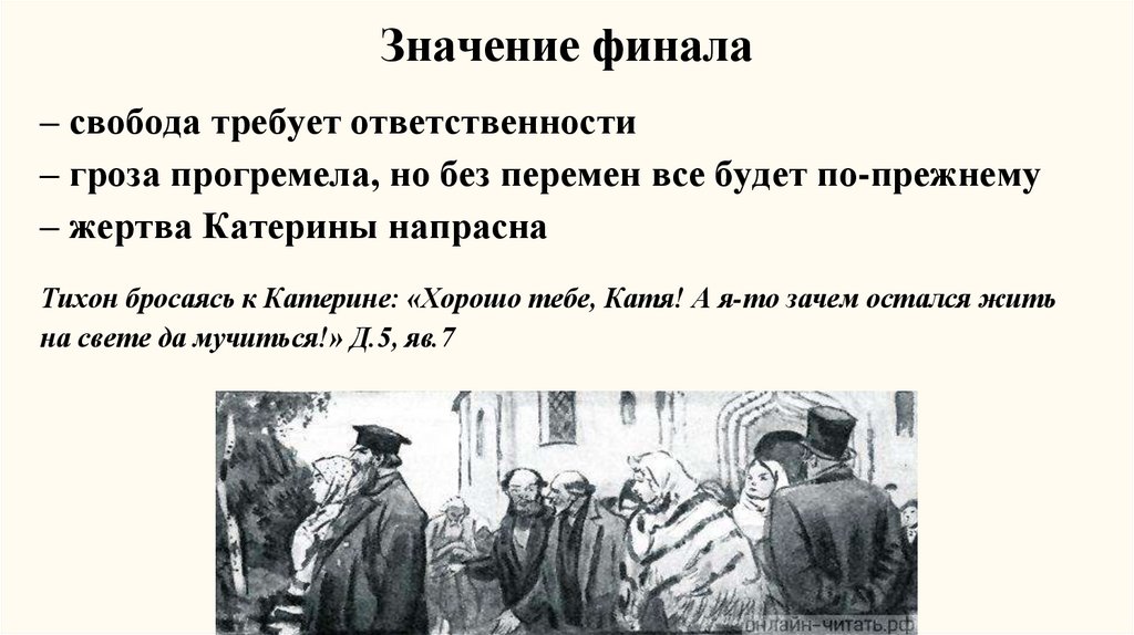 Тихон бросаясь к Катерине: «Хорошо тебе, Катя! А я-то зачем остался жить