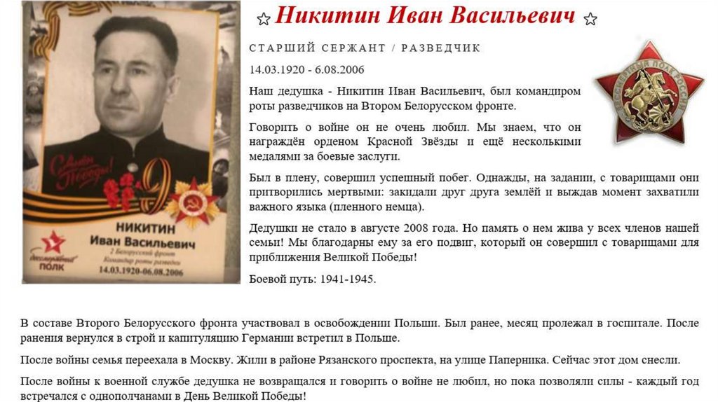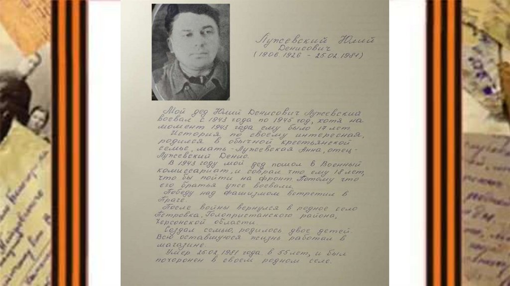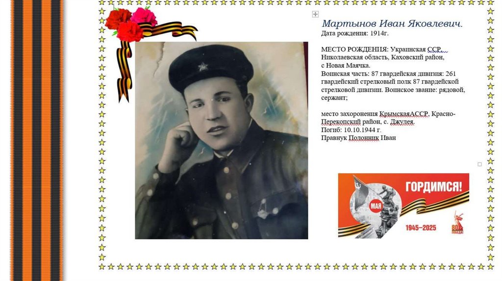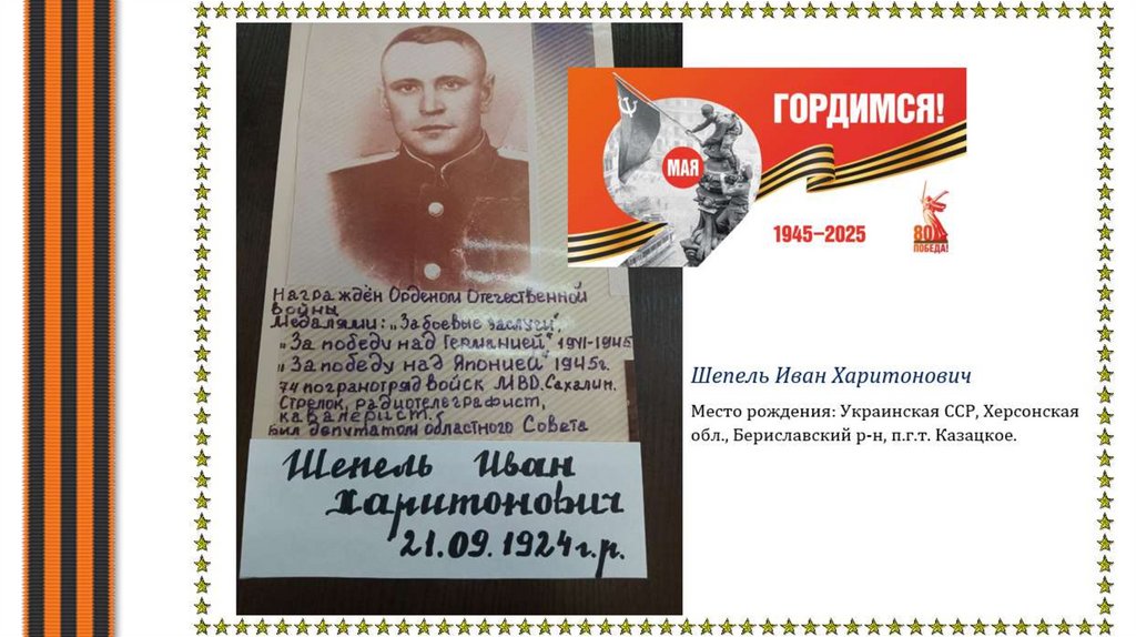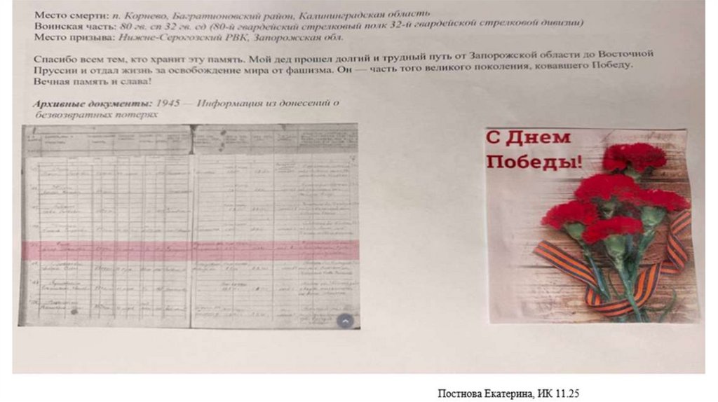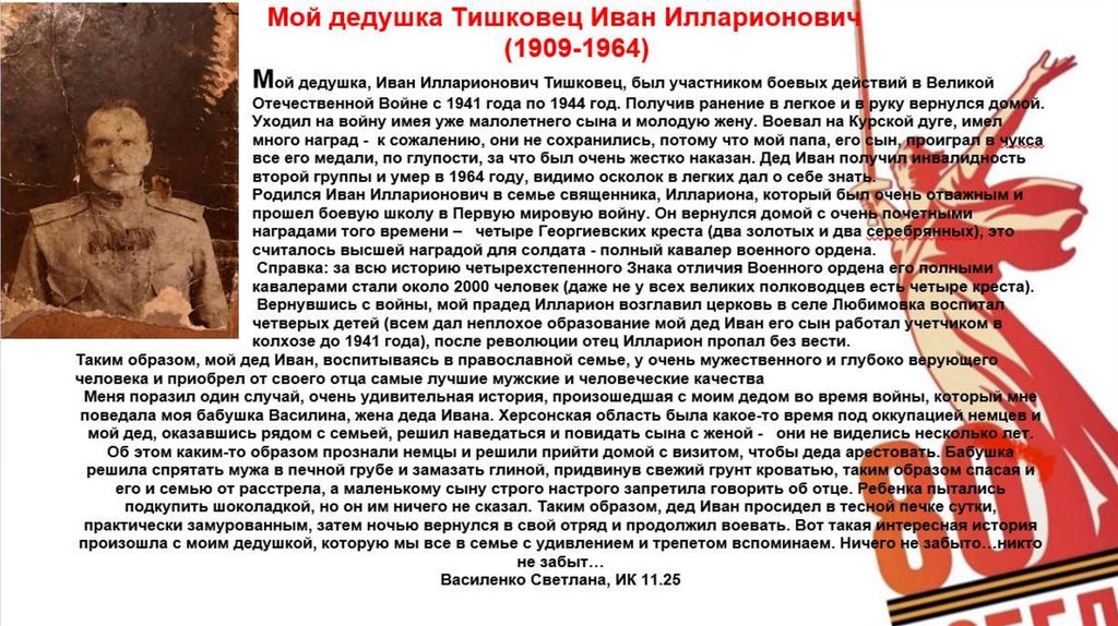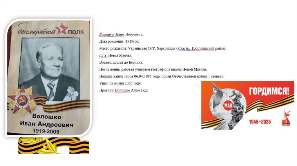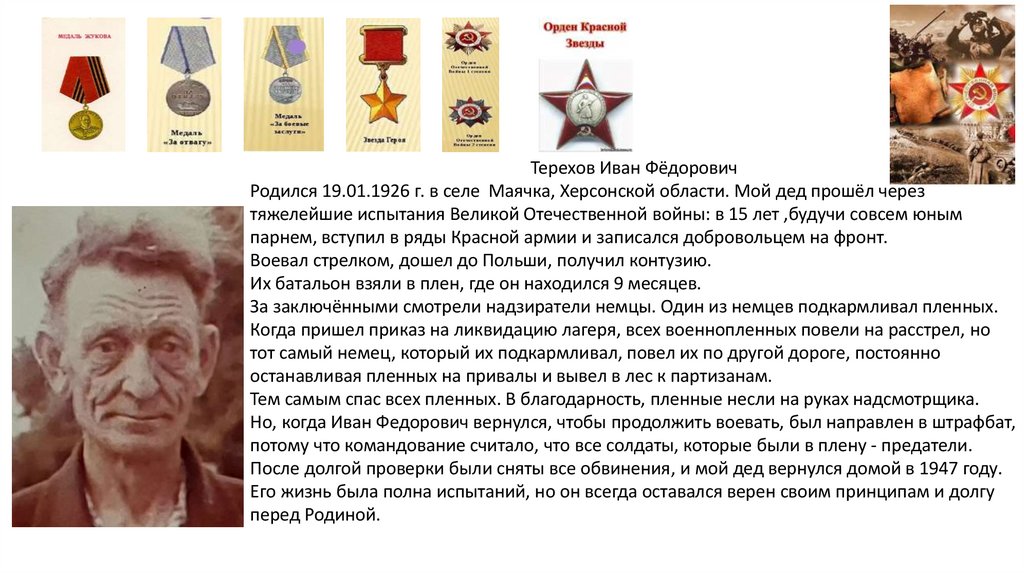 Терехов Иван ФёдоровичРодился 19.01.1926 г. в селе Маячка, Херсонской области. Мой дед прошёл через