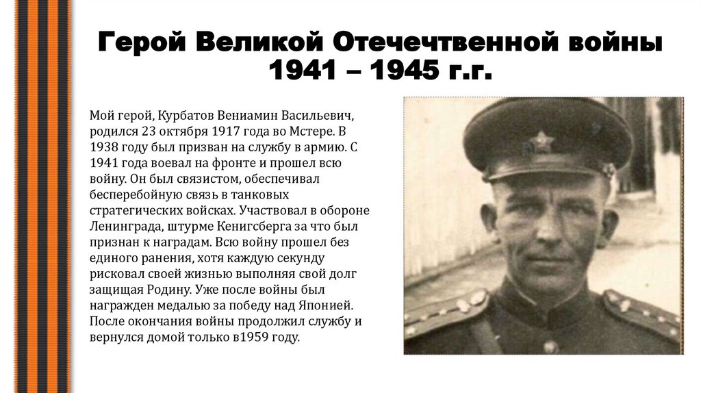 Мой герой, Курбатов Вениамин Васильевич,родился 23 октября 1917 года во Мстере. В