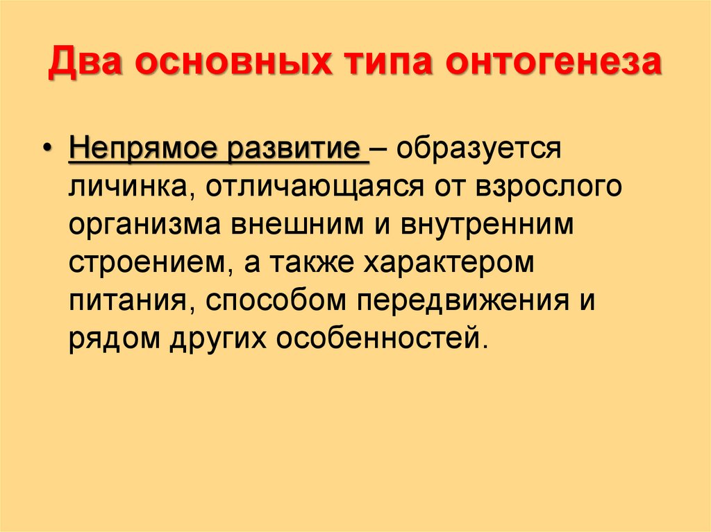 • Непрямое развитие – образуетсяличинка, отличающаяся от взрослого