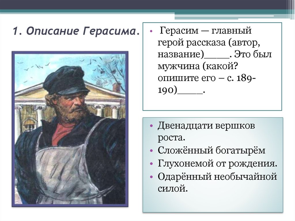 Герасим — главный герой рассказа (автор, название)____. Это