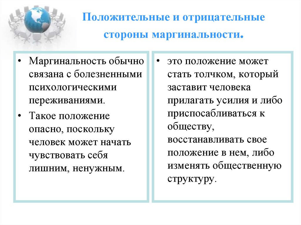 14. Положительные и отрицательные стороны маргинальности.