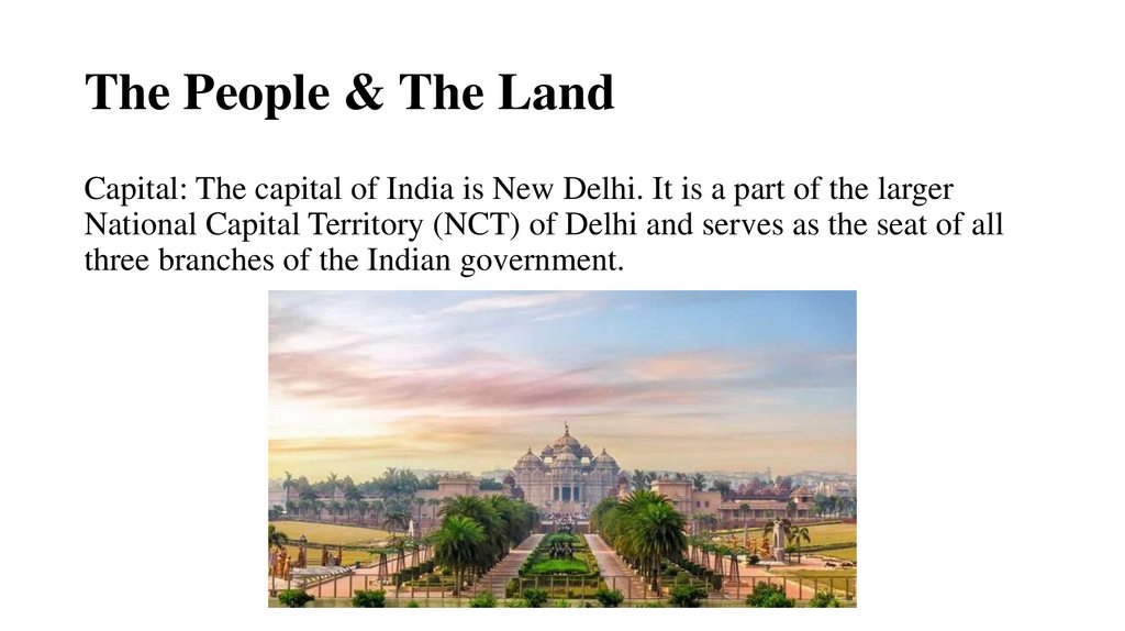 The People & The LandCapital: The capital of India is New Delhi. It is a part of the larger