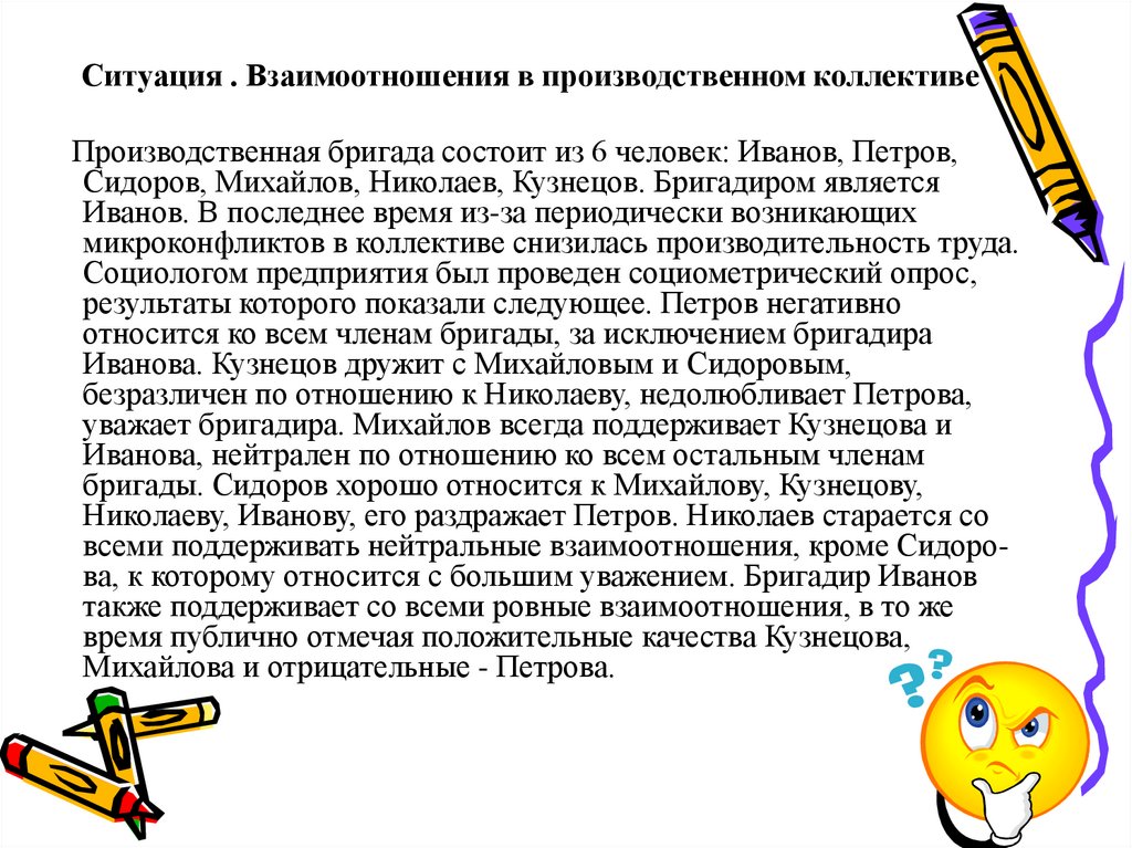 Ситуация . Взаимоотношения в производственном коллективеПроизводственная бригада состоит из 6 человек: Иванов, Петров,