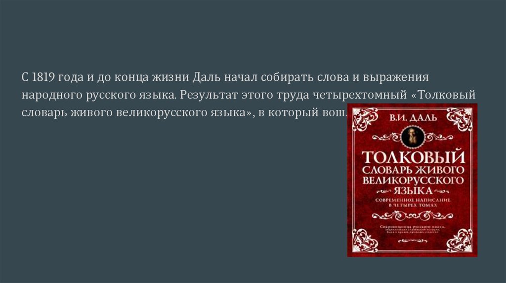 С 1819 года и до конца жизни Даль начал собирать слова и выражениянародного русского языка. Результат этого труда четырехтомный «Толковый