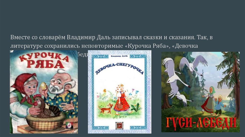 Вместе со словарём Владимир Даль записывал сказки и сказания. Так, влитературе сохранились неповторимые «Курочка Ряба», «Девочка