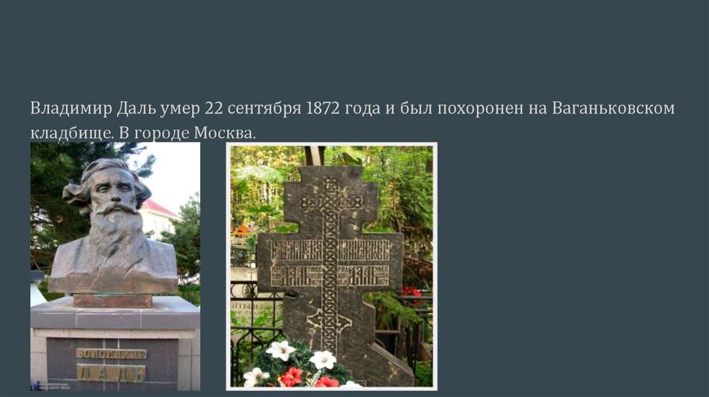 Владимир Даль умер 22 сентября 1872 года и был похоронен на Ваганьковскомкладбище. В городе Москва.