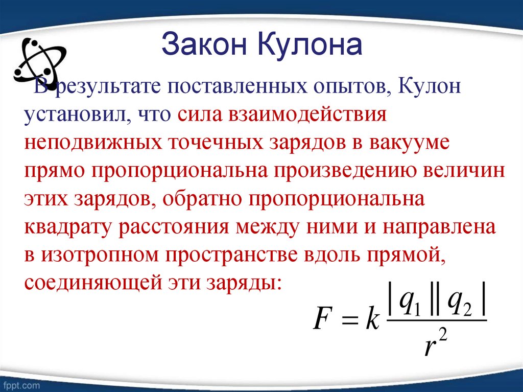 В результате поставленных опытов, Кулонустановил, что сила взаимодействия