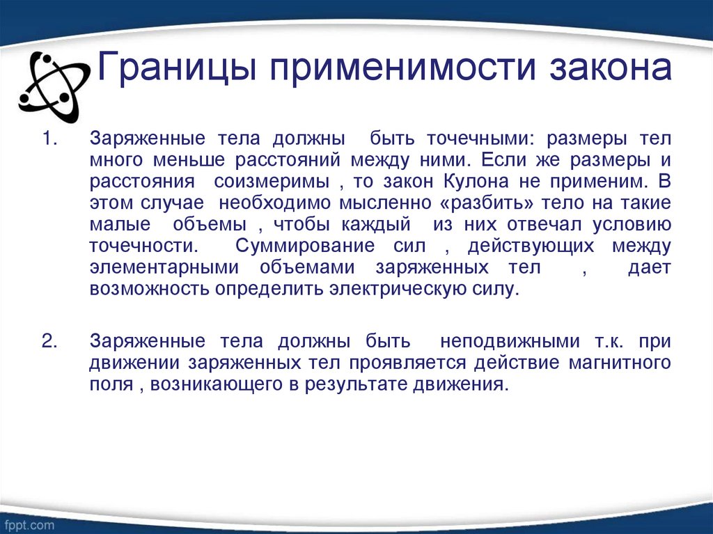 1.Заряженные тела должны быть точечными: размеры тел