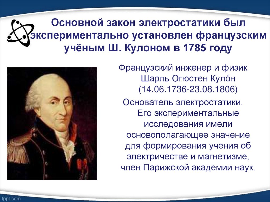 6. Основной закон электростатики был экспериментально установлен французским учёным Ш. Кулоном в 1785 году