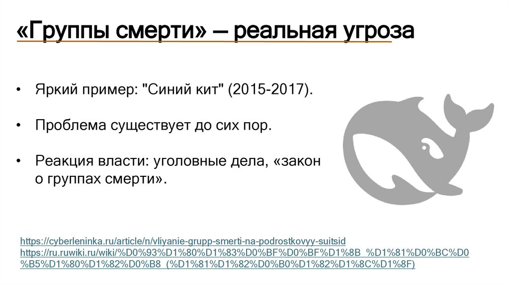 • Яркий пример: "Синий кит" (2015-2017).• Проблема существует до сих пор.