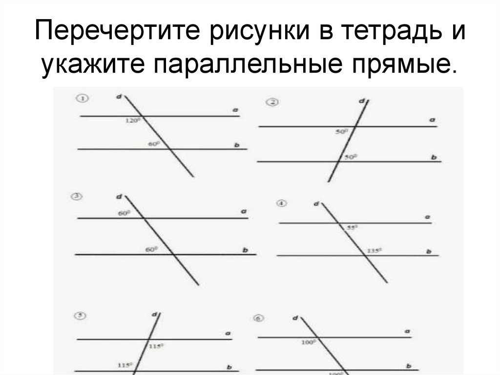 Перечертите рисунки в тетрадь и укажите параллельные прямые.