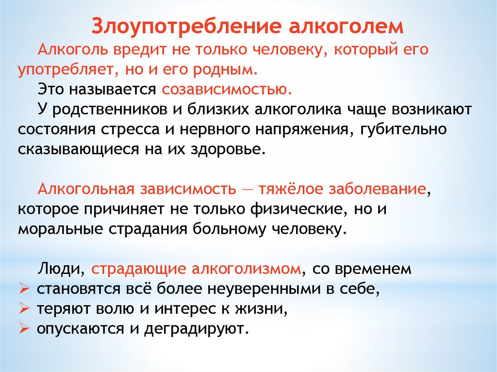 Злоупотребление алкоголемАлкоголь вредит не только человеку, который его