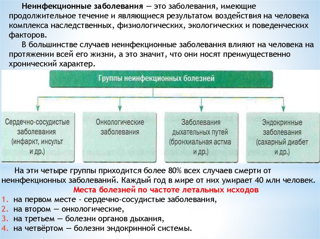 Неинфекционные заболевания — это заболевания, имеющиепродолжительное течение и являющиеся результатом воздействия на человека