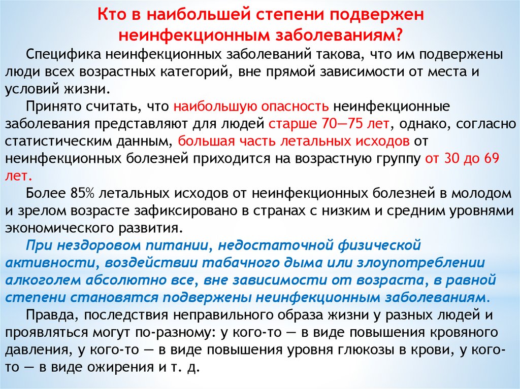 Специфика неинфекционных заболеваний такова, что им подвержены