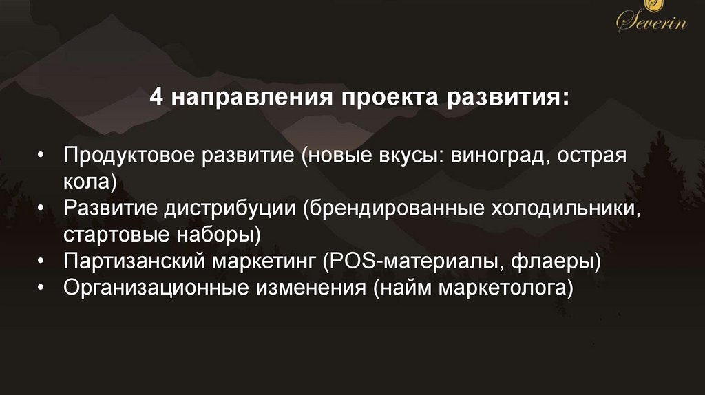 4 направления проекта развития:• Продуктовое развитие (новые вкусы: виноград, острая