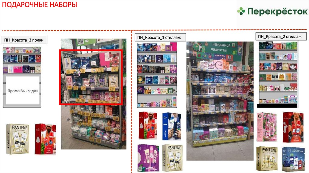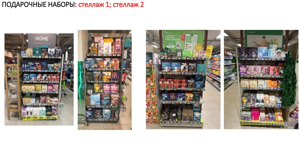 ПОДАРОЧНЫЕ НАБОРЫРазмещение СОГЛАСНО типу ДМП, каждое СКЮ прописано на определенном месте продаж: