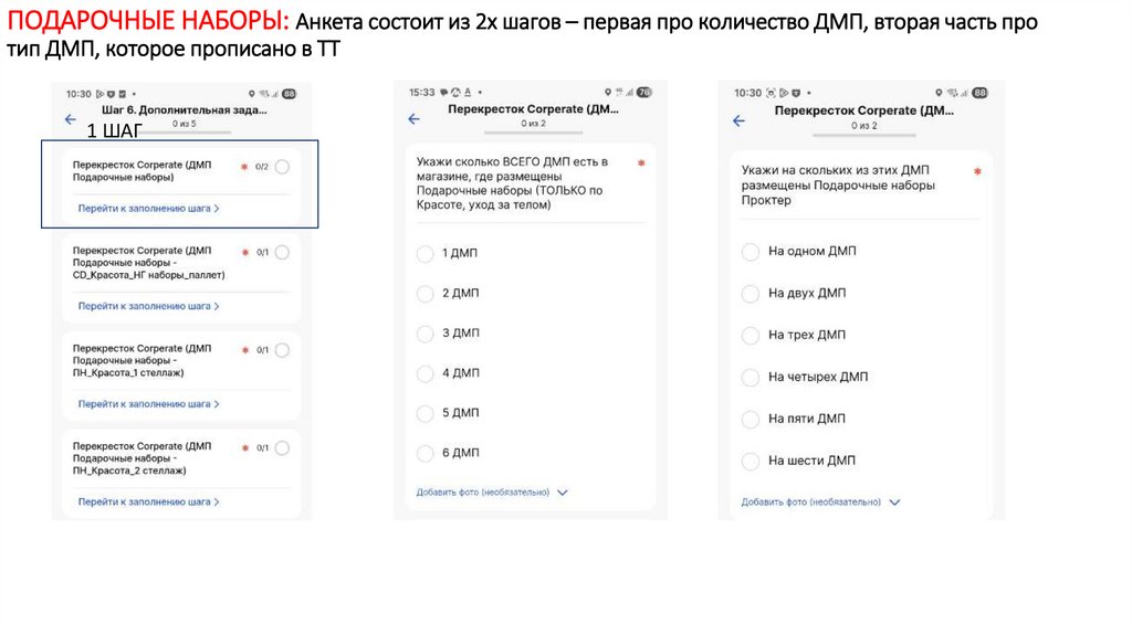 ПОДАРОЧНЫЕ НАБОРЫ: Анкета состоит из 2х шагов – первая про количество ДМП, вторая часть протип ДМП, которое прописано в ТТ