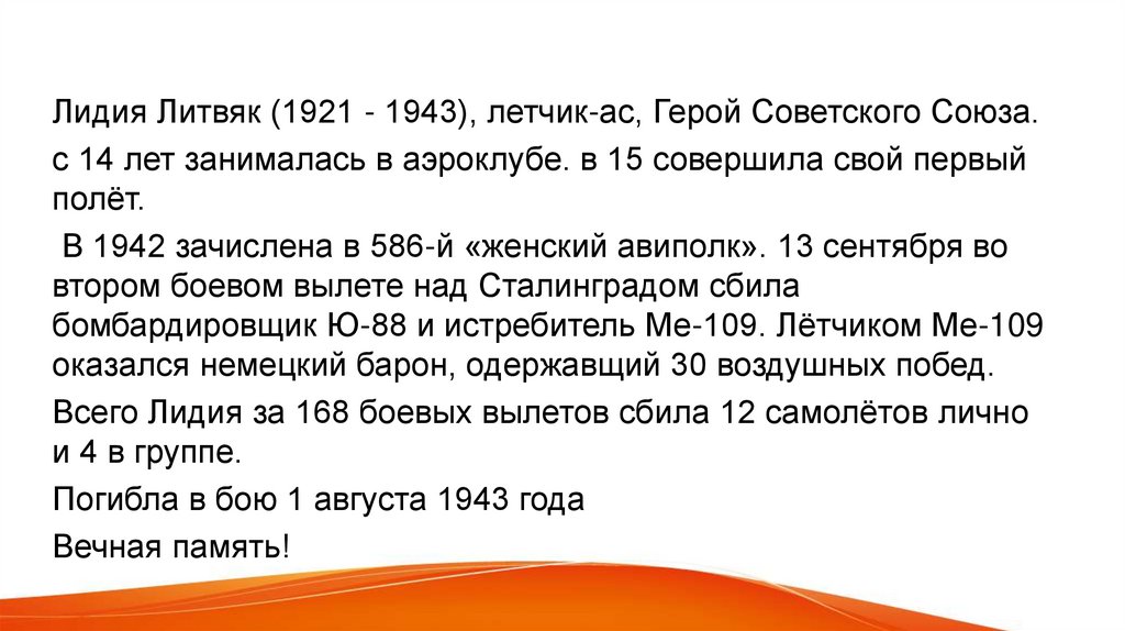 • Лидия Литвяк прожила короткую, но яркую, героическую,