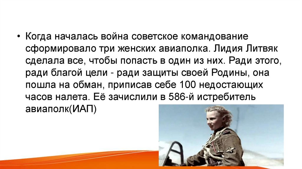 • Когда началась война советское командованиесформировало три женских авиаполка. Лидия Литвяк