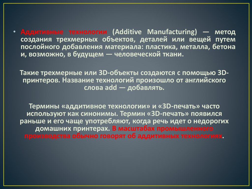 • Аддитивные технологии (Additive Manufacturing) — методсоздания трехмерных объектов, деталей или вещей путем