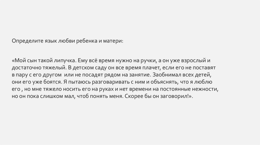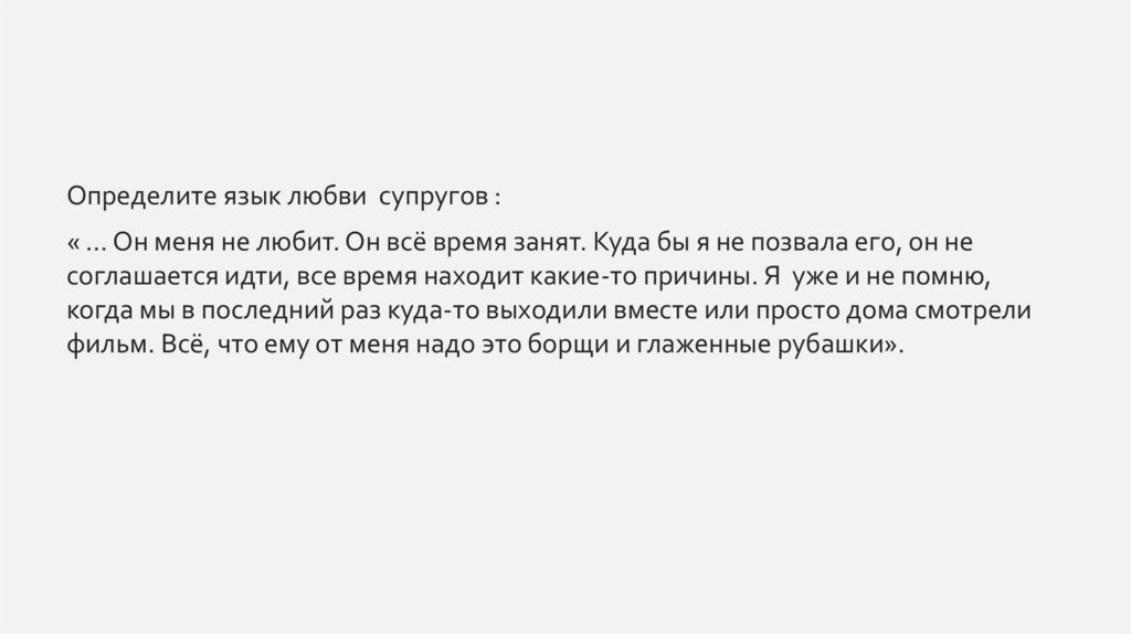 Определите язык любви супругов :« … Он меня не любит. Он всё время занят. Куда бы я не позвала его, он не