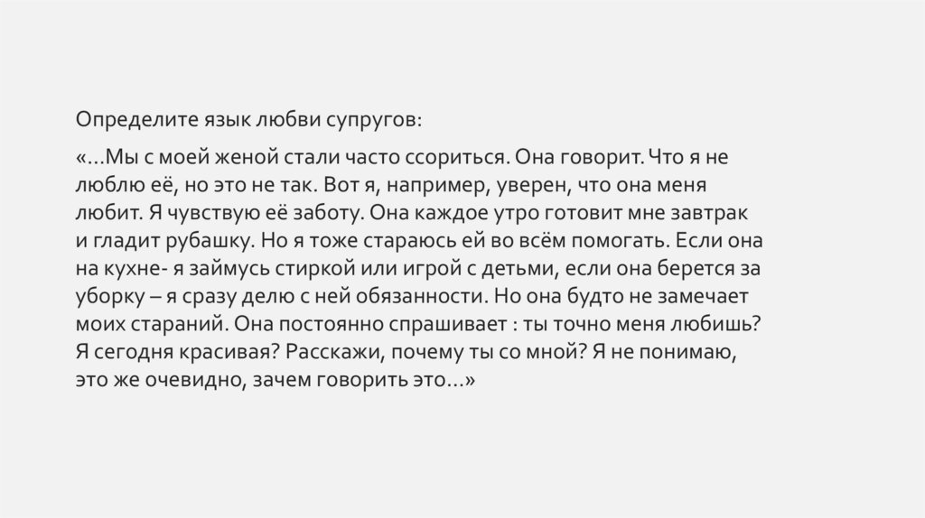 Определите язык любви супругов:«…Мы с моей женой стали часто ссориться. Она говорит. Что я не