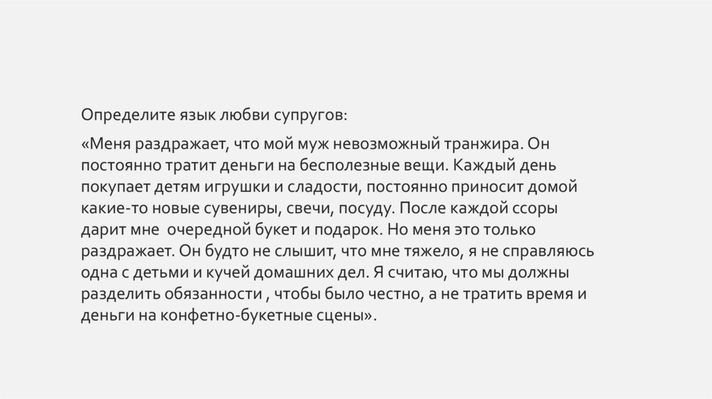 Определите язык любви супругов:«Меня раздражает, что мой муж невозможный транжира. Он