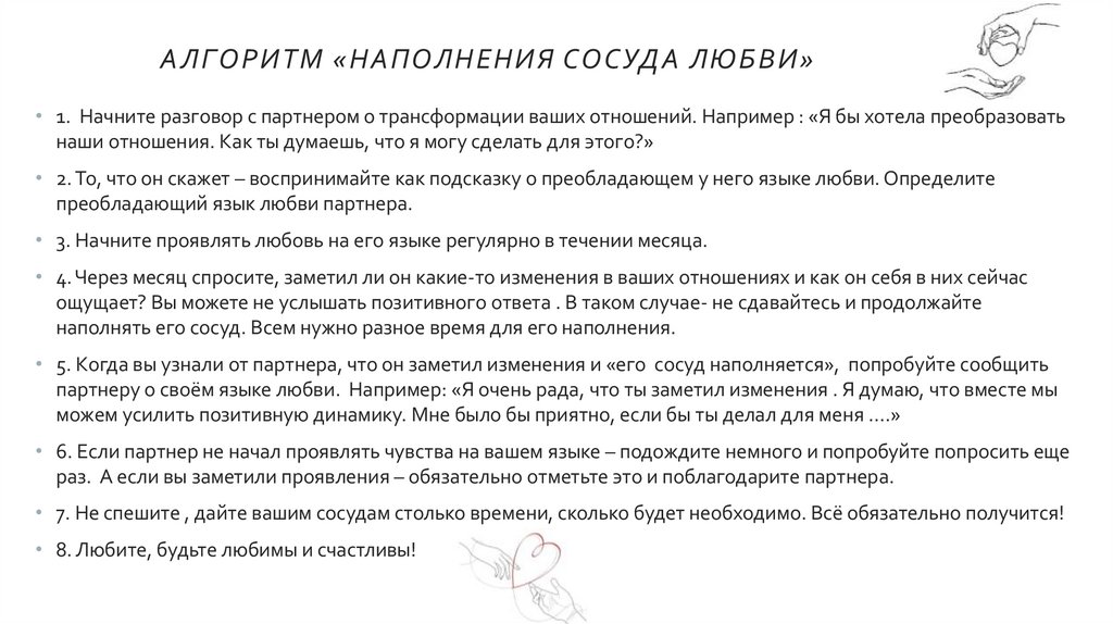 АЛГОРИТМ «НАПОЛНЕНИЯ СОСУДА ЛЮБВИ»• 1. Начните разговор с партнером о трансформации ваших отношений. Например : «Я бы хотела преобразовать