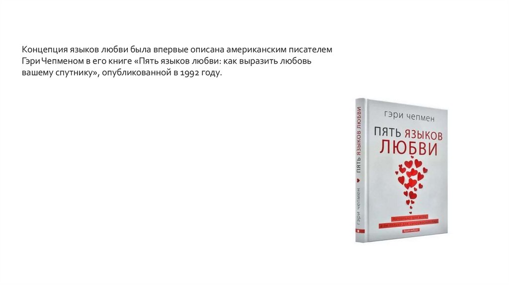 Концепция языков любви была впервые описана американским писателемГэри Чепменом в его книге «Пять языков любви: как выразить любовь