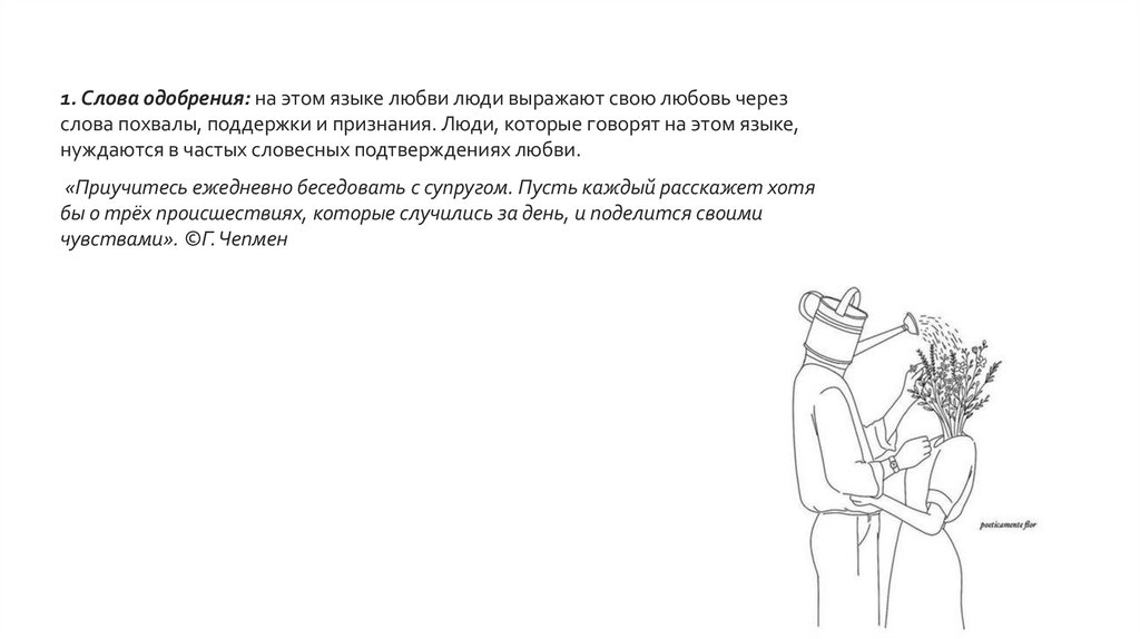 1. Слова одобрения: на этом языке любви люди выражают свою любовь черезслова похвалы, поддержки и признания. Люди, которые говорят на этом языке,