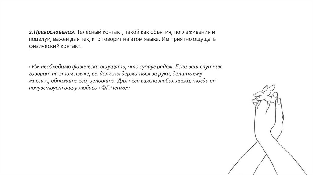 2.Прикосновения. Телесный контакт, такой как объятия, поглаживания ипоцелуи, важен для тех, кто говорит на этом языке. Им приятно ощущать