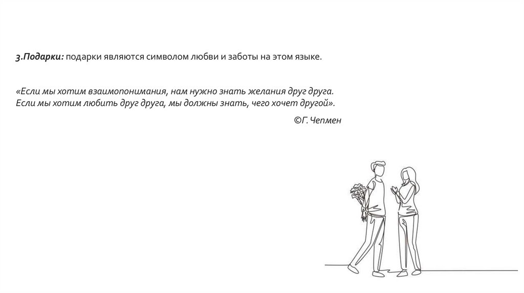 3.Подарки: подарки являются символом любви и заботы на этом языке.«Если мы хотим взаимопонимания, нам нужно знать желания друг друга.
