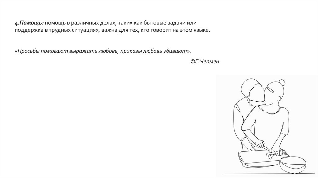 4.Помощь: помощь в различных делах, таких как бытовые задачи илиподдержка в трудных ситуациях, важна для тех, кто говорит на этом языке.